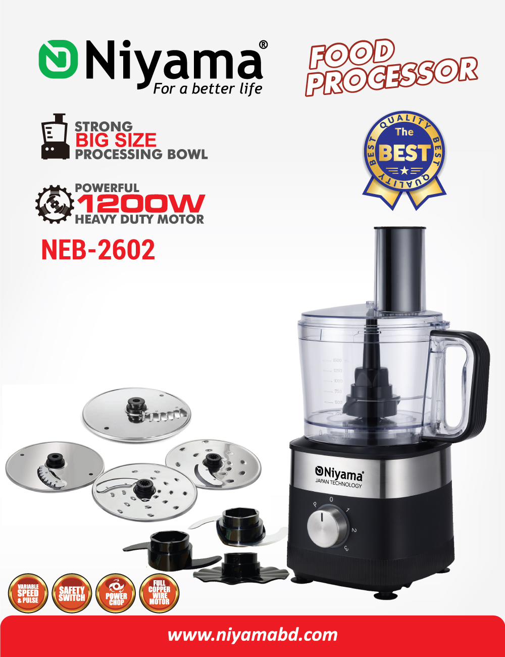 অ্যাক্সেসরিজ: চপার, ডো মেকার, ফ্রেঞ্চ ফ্রাই ডিস্ক, জুলিয়েন ডিস্ক, ফাইন শ্রেডিং ও স্লাইসিং ডিস্ক, কোর্স শ্রেডিং ও স্লাইসিং ডিস্ক